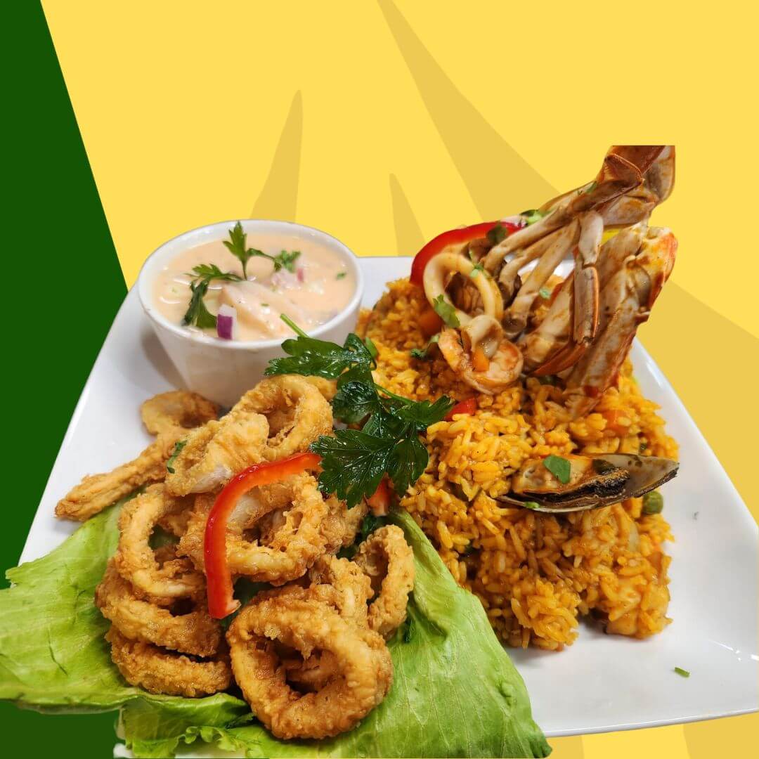 Marine Combo includes: Rice with seafood in paella style, Fish Ceviche and breaded seafood and calamari